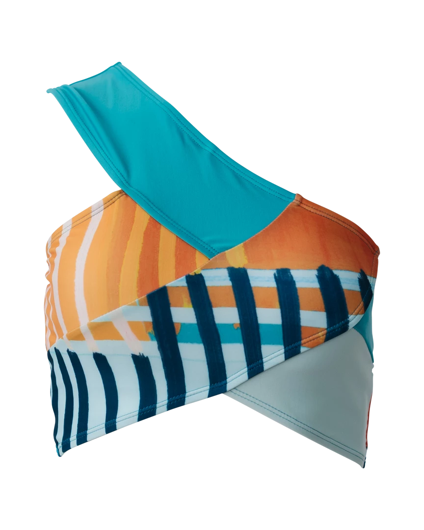 Our all-new 2022 funky striped Ray print includes Coastal navy, bright Rio orange, apricot orange, and a light illusion blue. The right shoulder is bright turquoise with a lower light illusion blue bottom left.