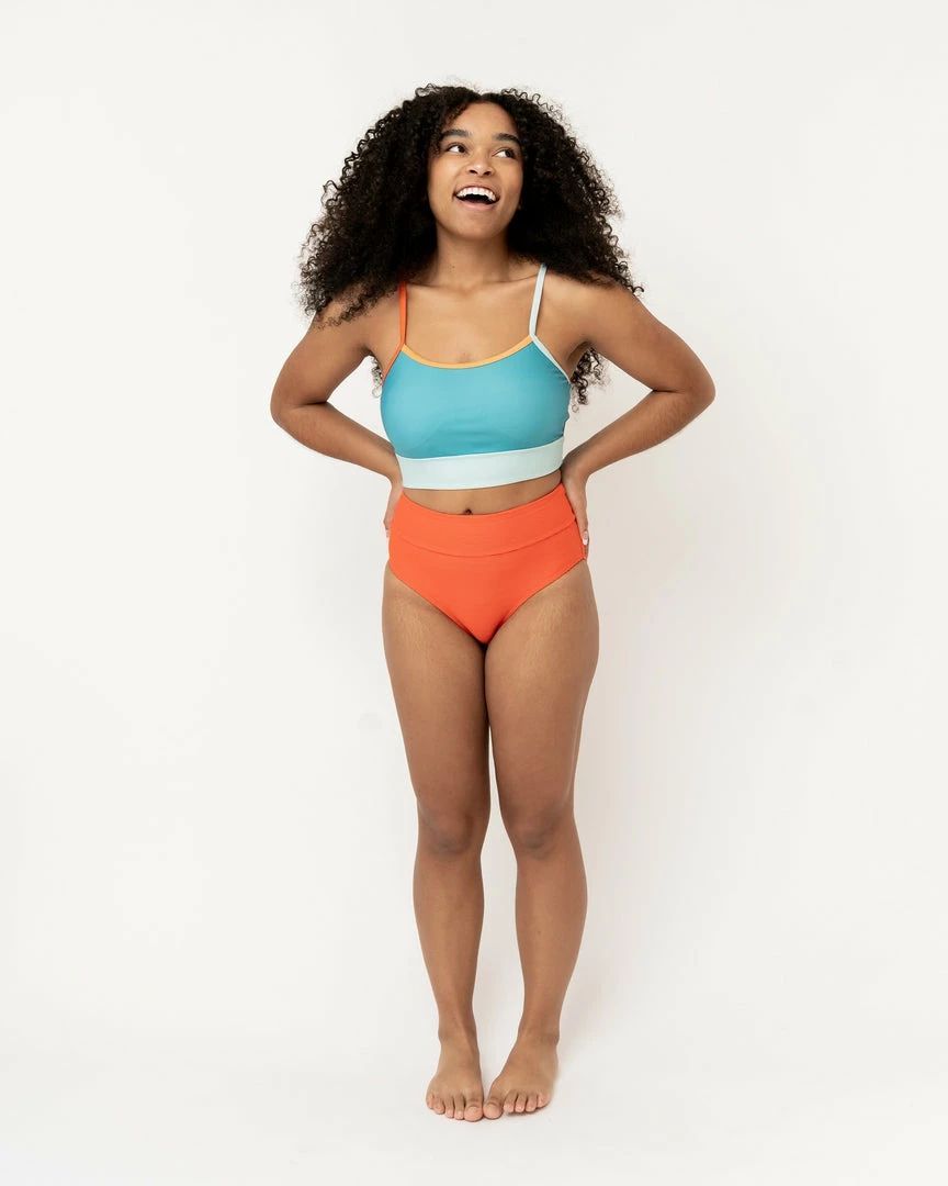 Keeping it simple, this bottom is the perfect everyday option to pair with a busy top.  Our new ribbed fabric adds a modern flair to a classic style. Our brand new bright tangerine color will have you in style all year.