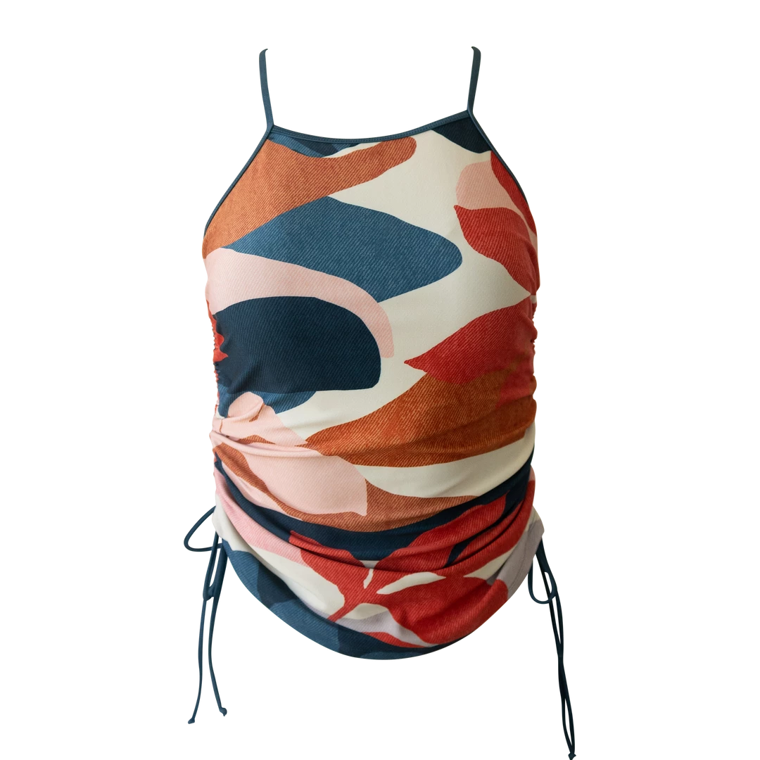 Make a splash in the on-trend modern print of the Vista tankini. Flattering side ruching for an adjustable length. Adjustable straps and a high neck for active comfort.Â